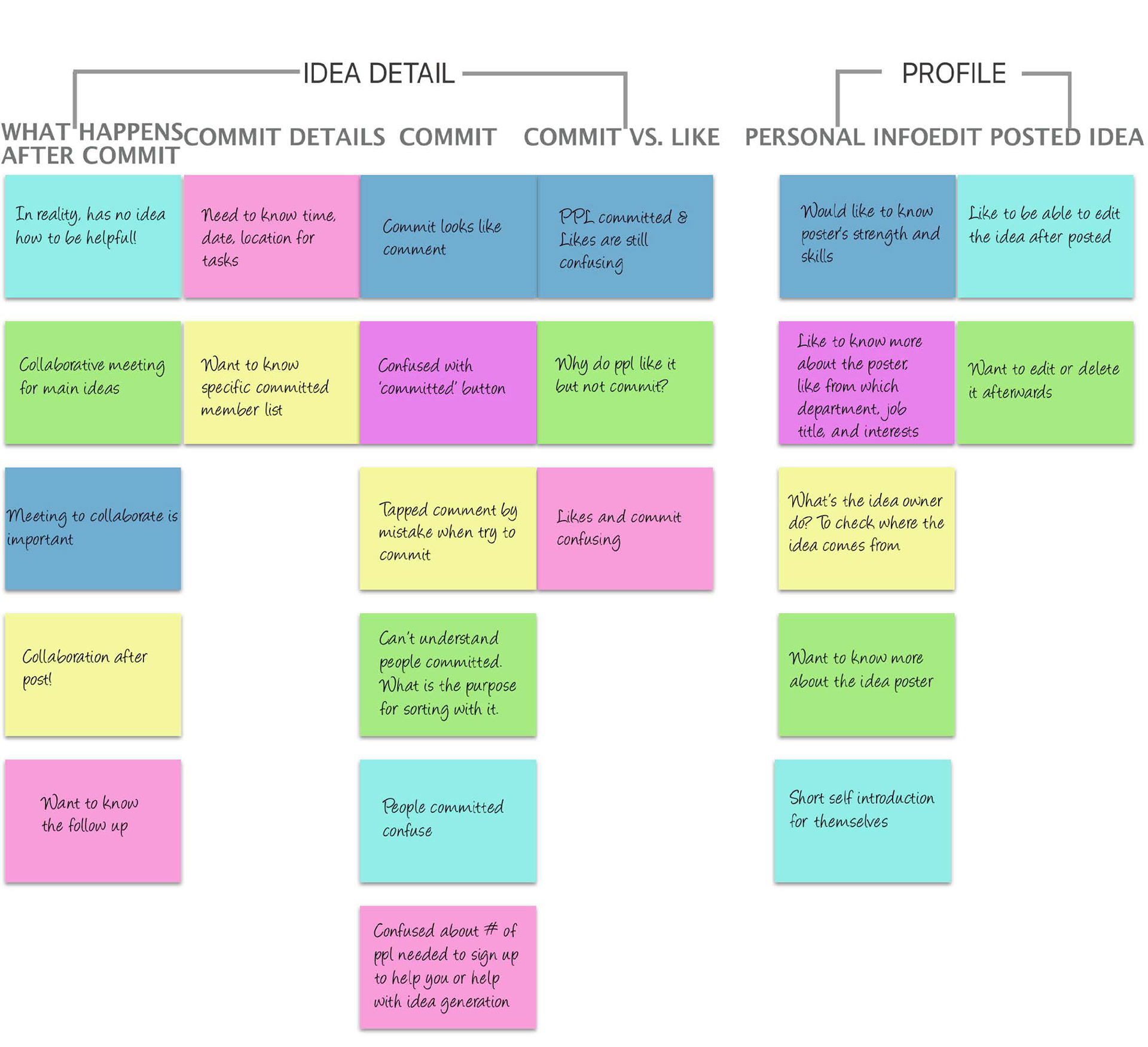 We conducted 12 usability tests in total (6 for Idea Drop and 6 for Ideascale). We asked our subjects to perform a series of tasks within the application and had them narrate their thought process, We then consolidated all of our notes and took note of common insights and pain points.