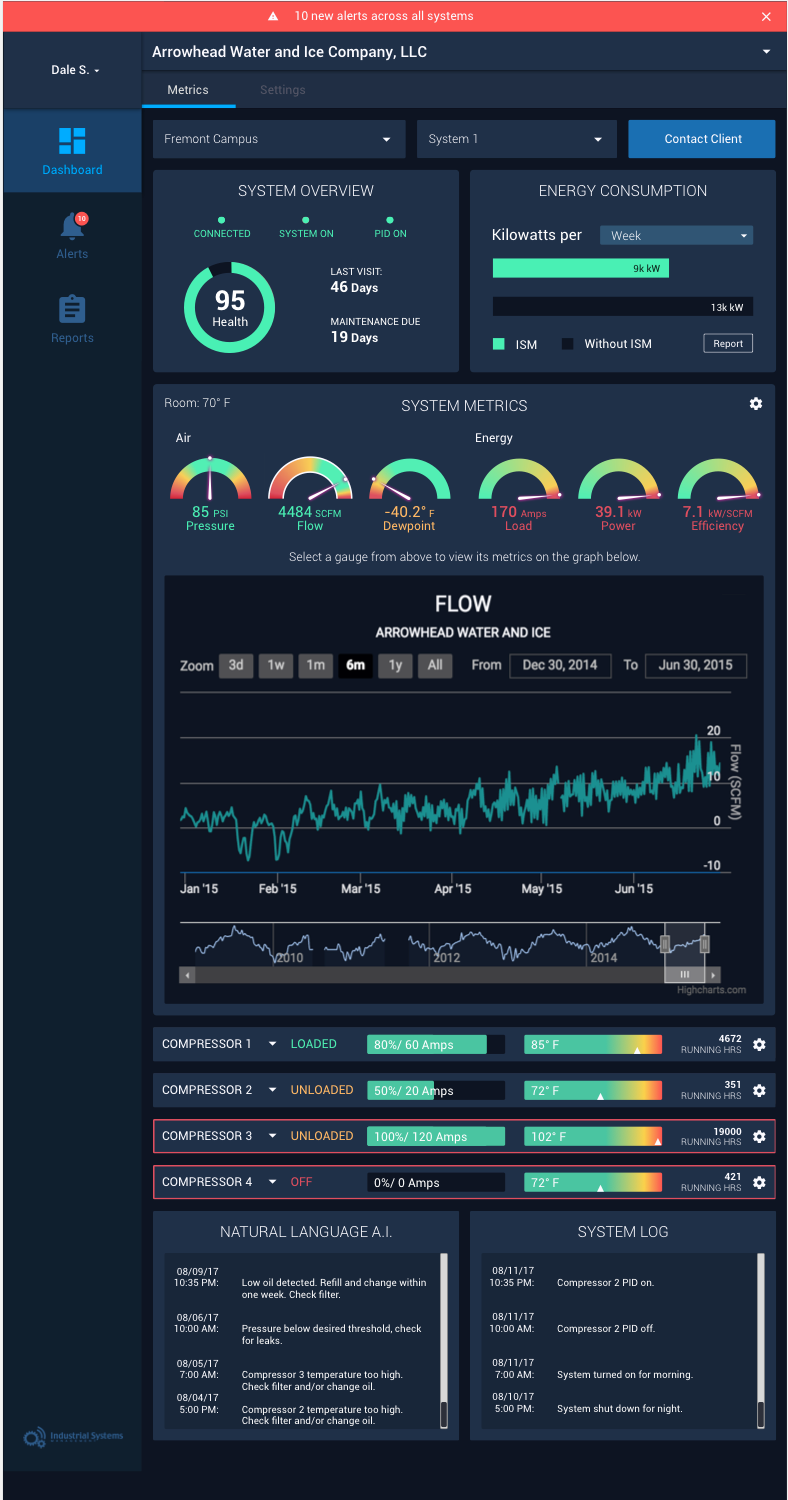 Industrial Systems Management is an early stage startup developing a system that uses machine learning and AI to monitor air compressor systems and predict future issues and maintenance needs. Their target users are both the factory workers using air compressors and the air compressor distributors. Their product is a dashboard that enables the workers to easily monitor their systems but also alerts the distributor of any required maintenance. I worked with a team of seven other designers to develop this product.