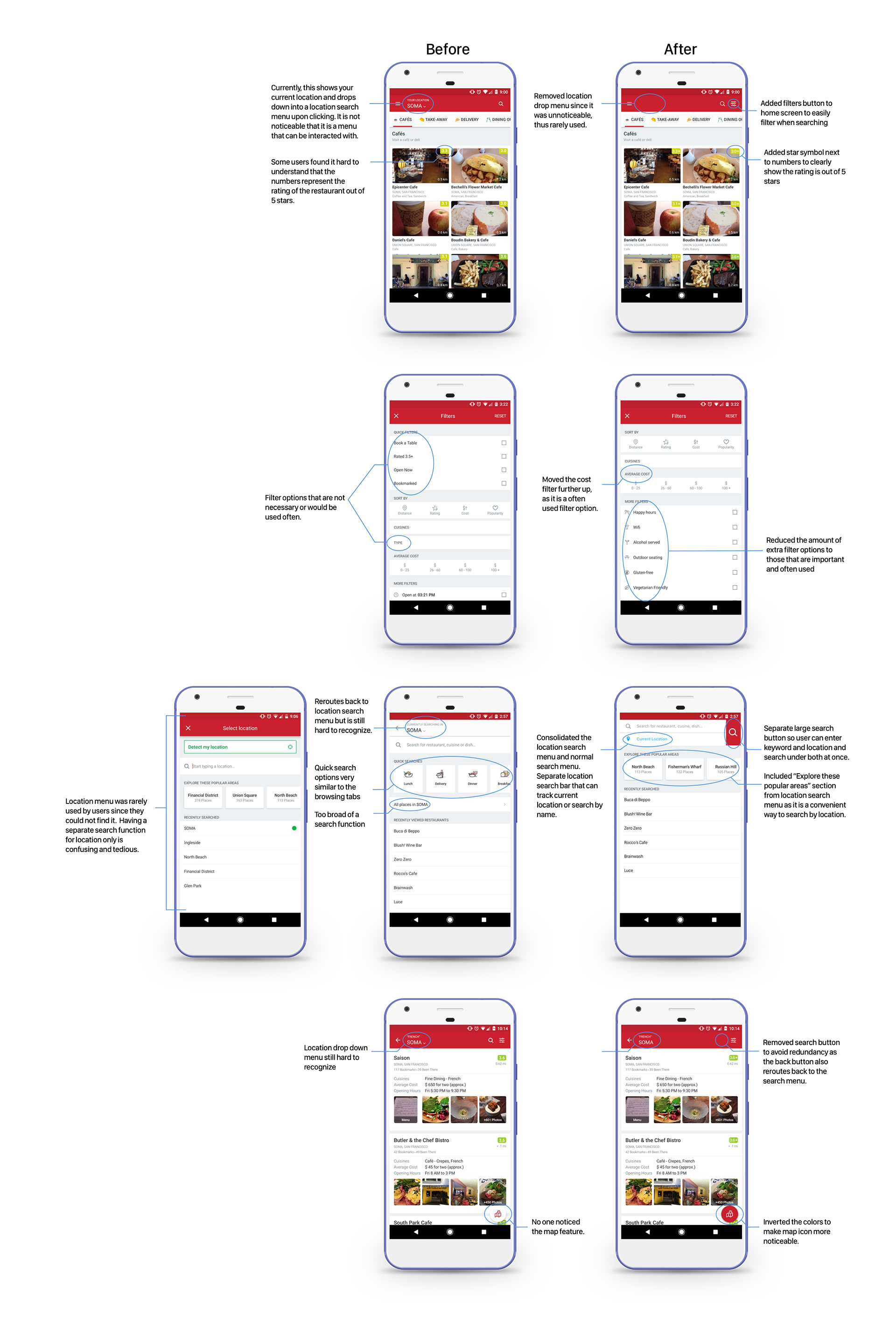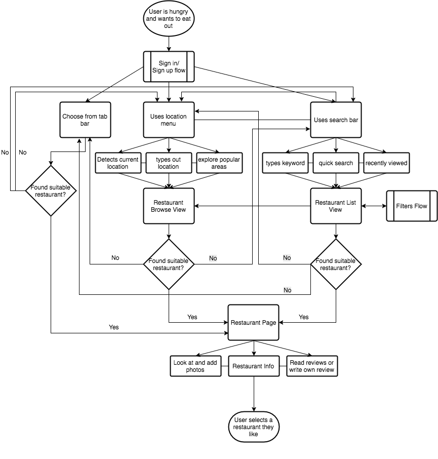 The task flow was fairly complex because there are so many different methods to search for a restaurant and they connect back to each other, making the process very confusing. Learning this helped me narrow down how I would redesign the app.
