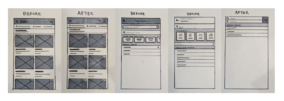 After synthesizing the key pain points and problems I wanted to address, I began the process of sketching out possible redesigns to improve the UI of the application. The four main screens I wanted to address were the home page and its navigation, the filters page, the search menu, and the search results page.